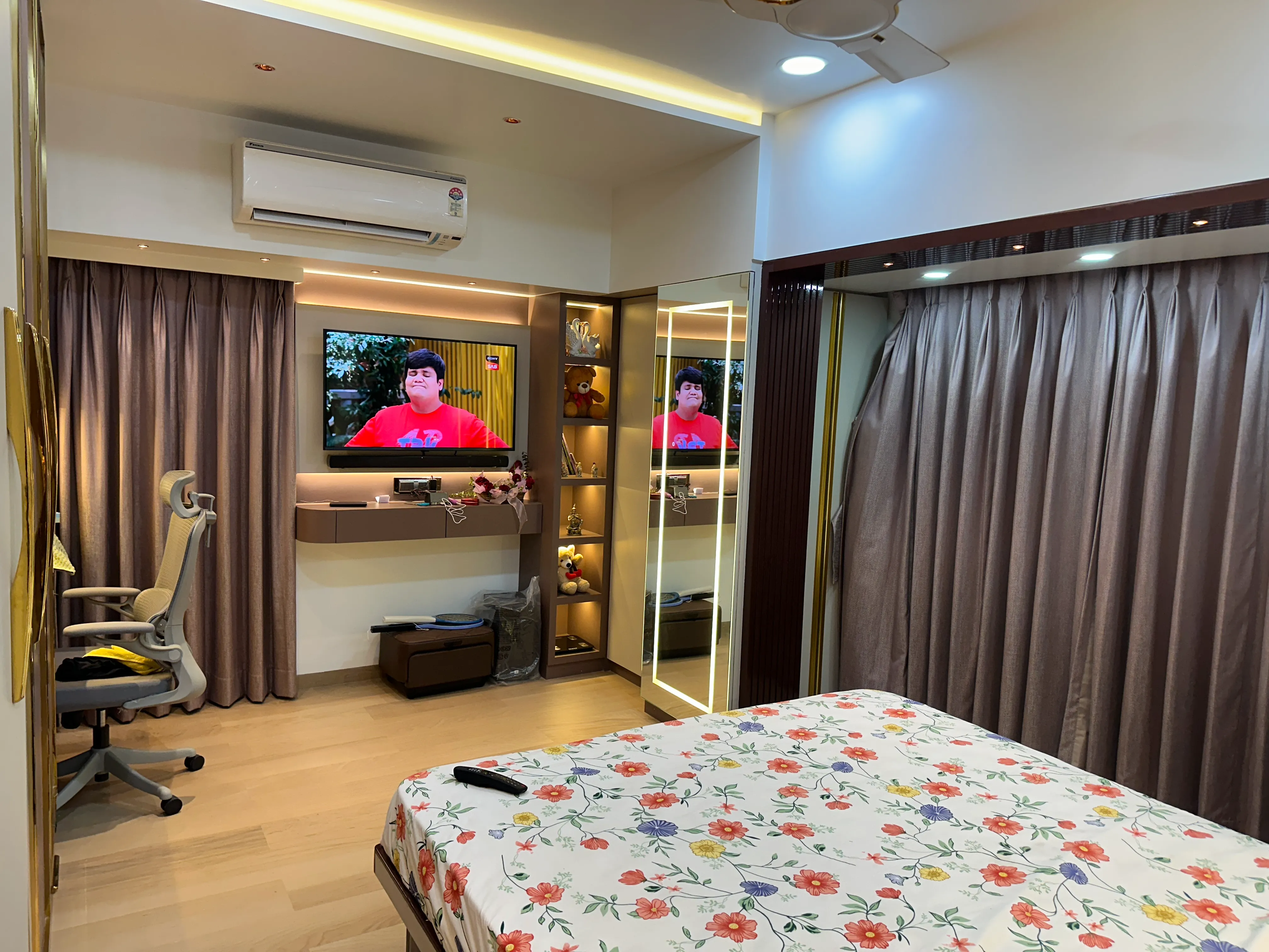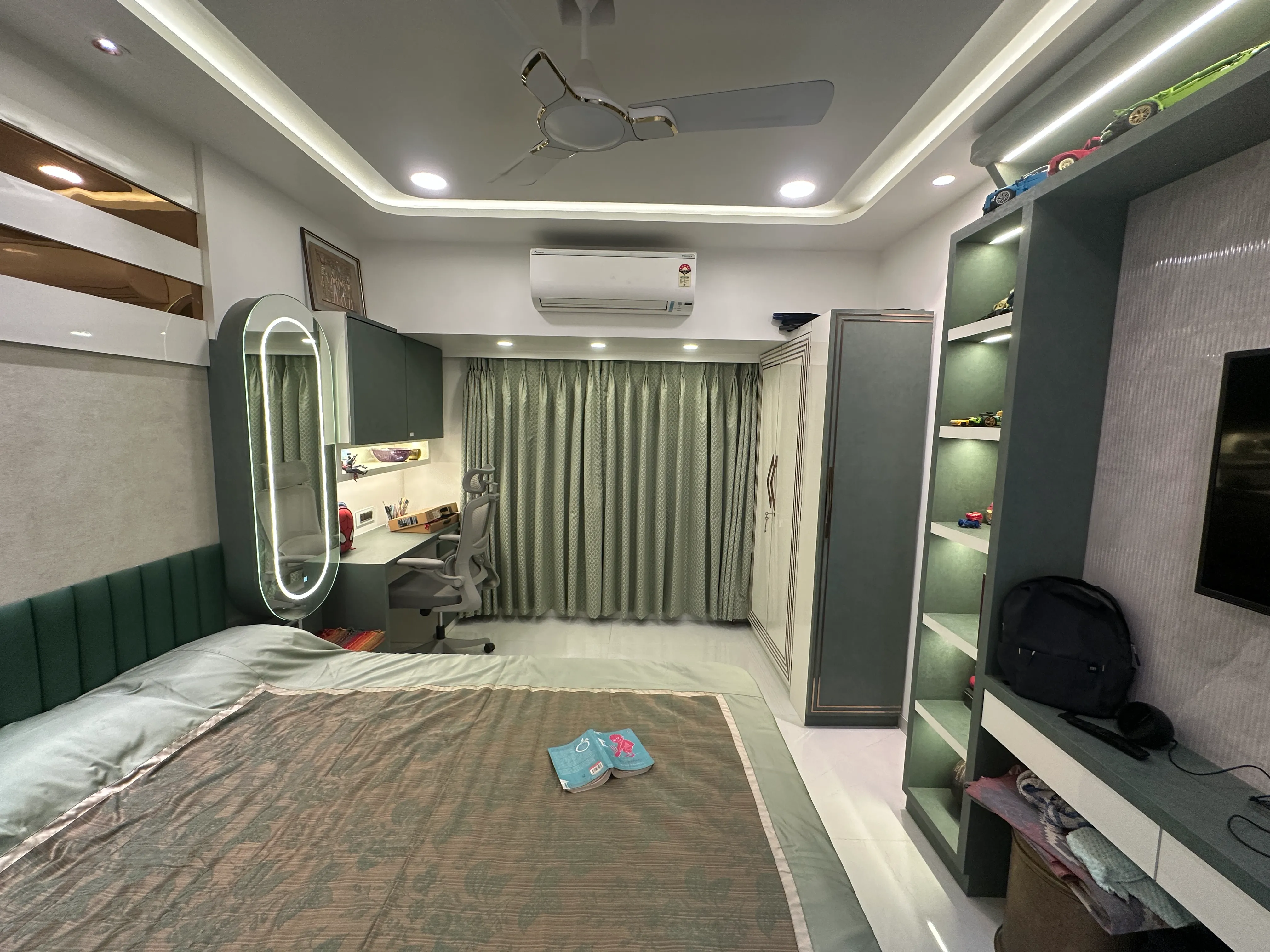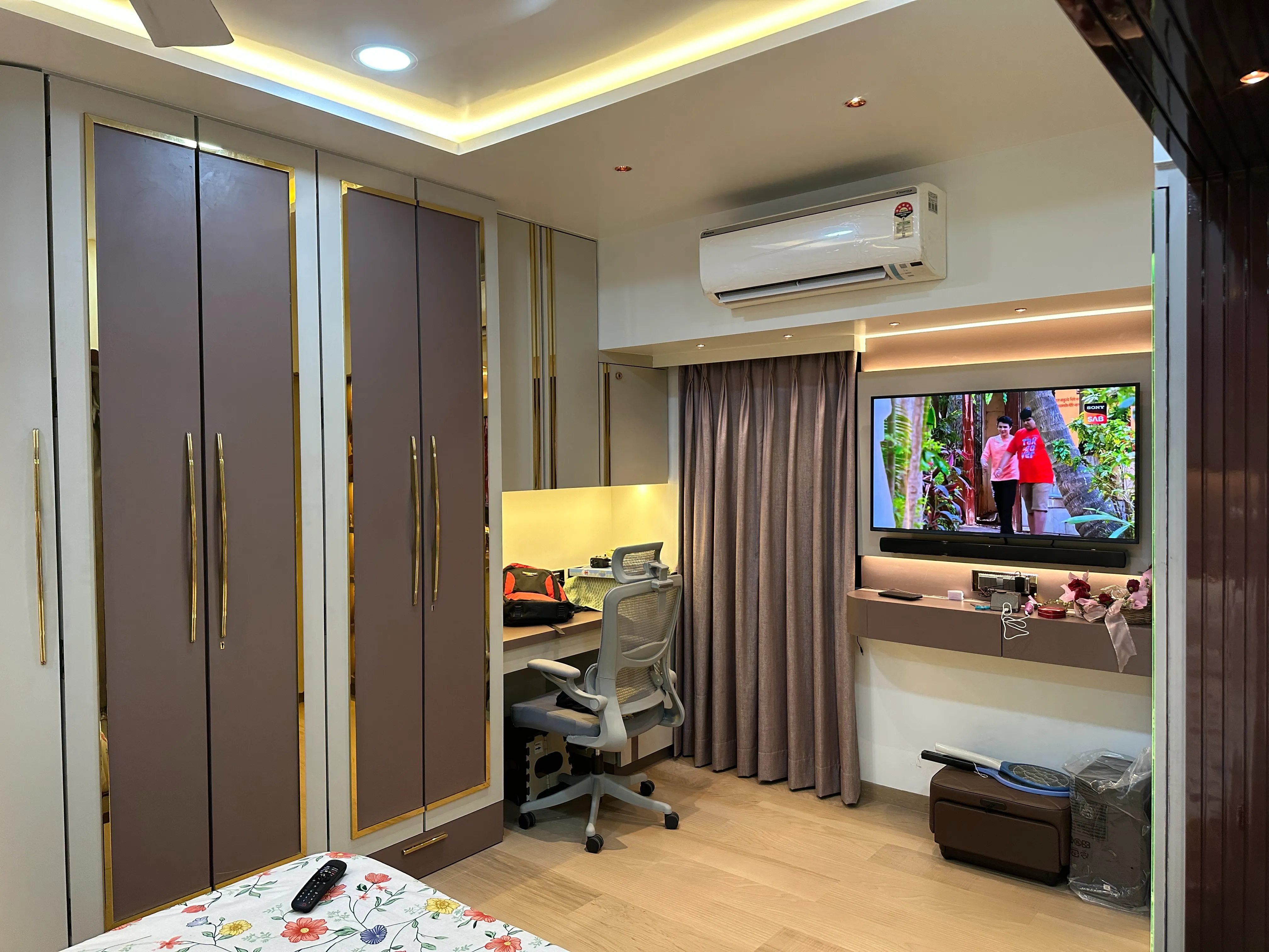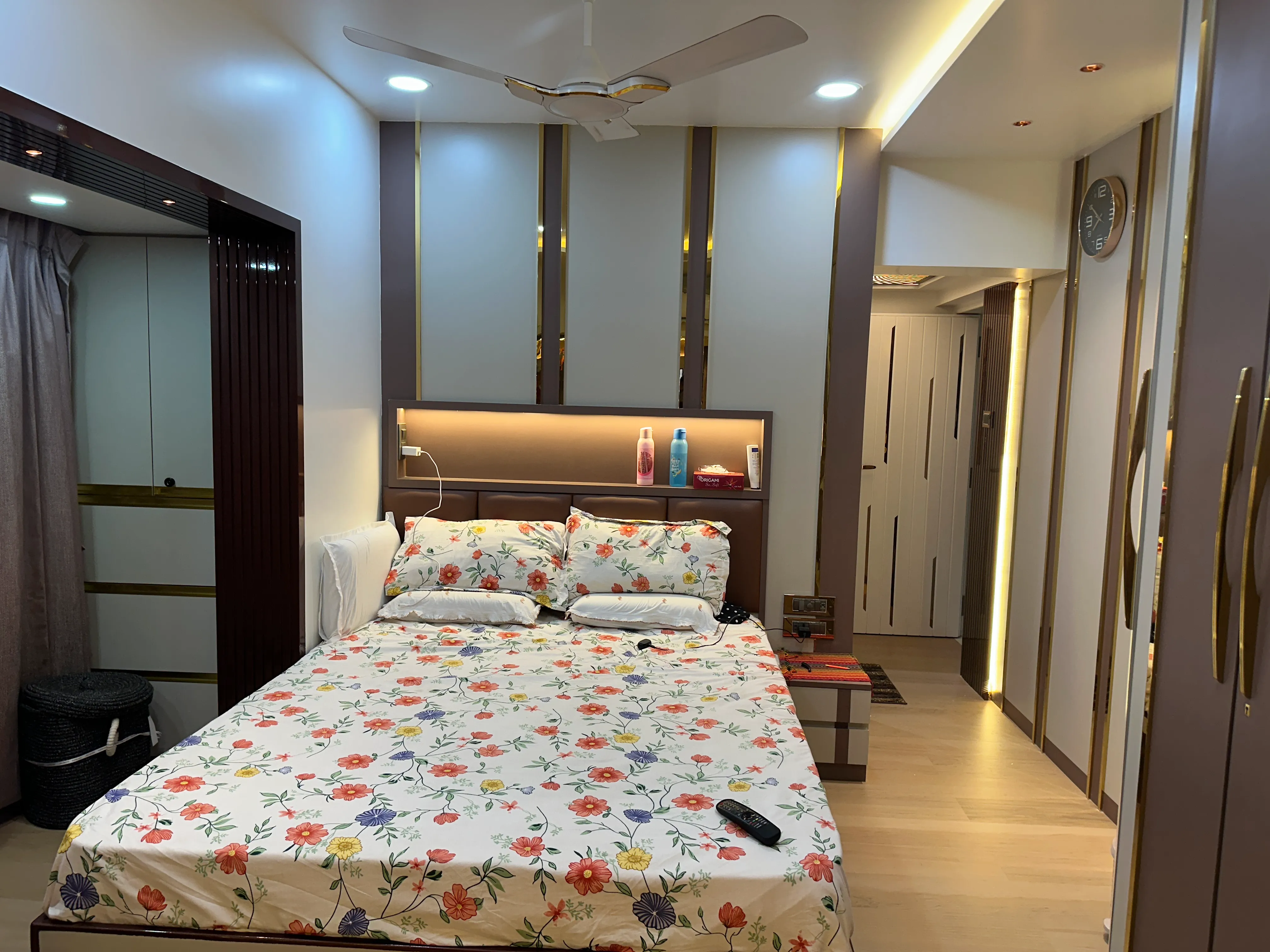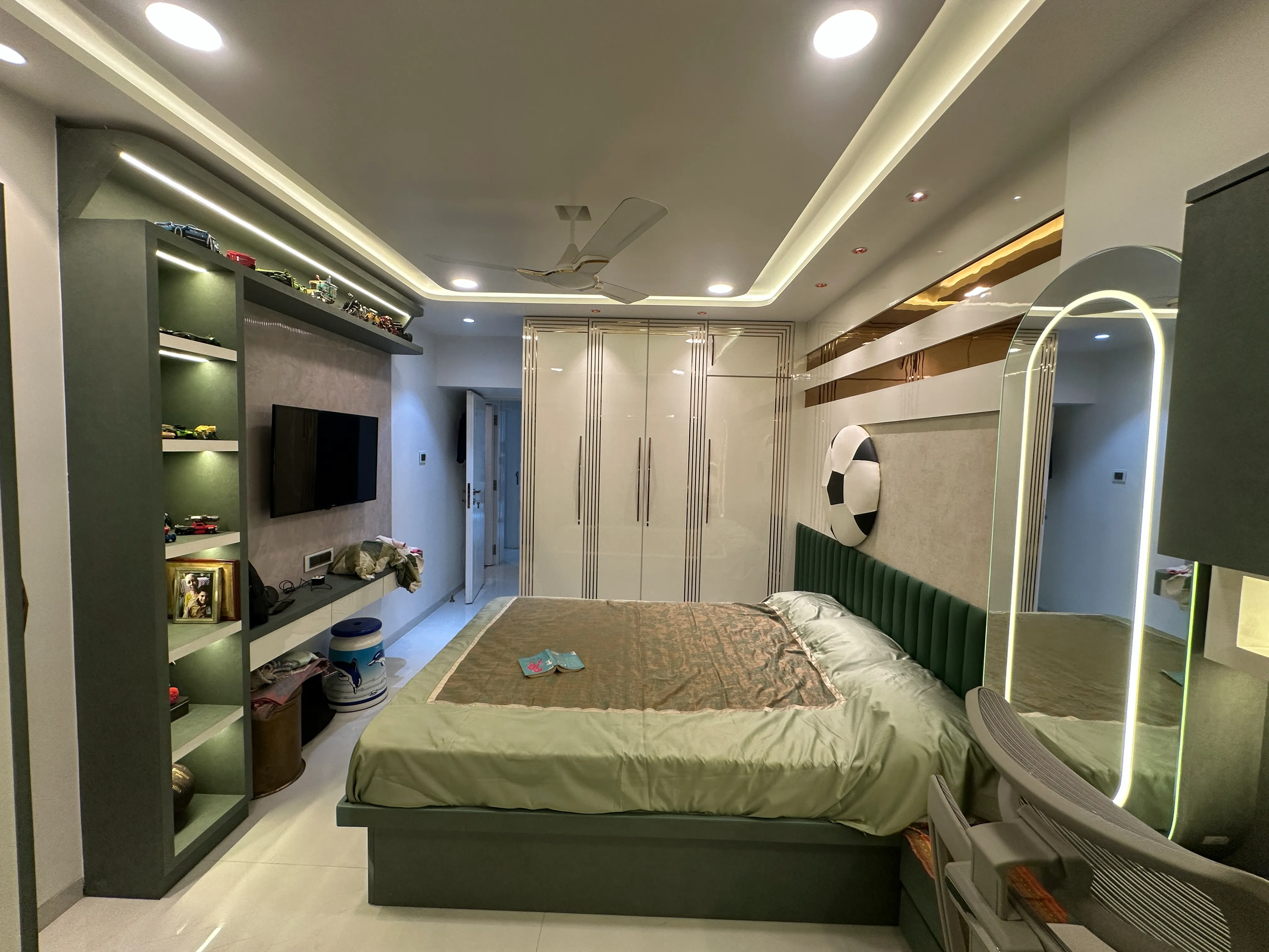 The master bedroom was crafted to be a true retreat, emphasizing clean lines and understated luxury. We employed a sophisticated, calming palette of muted taupes and warm wood tones, designed to maximize restfulness. The room is grounded by a streamlined, panelled headboard wall that incorporates integrated ambient lighting for a soft, resort-like glow. Essential, full-height wardrobes were blended seamlessly into the architecture, ensuring optimal storage while maintaining the room's spacious and tranquil atmosphere.