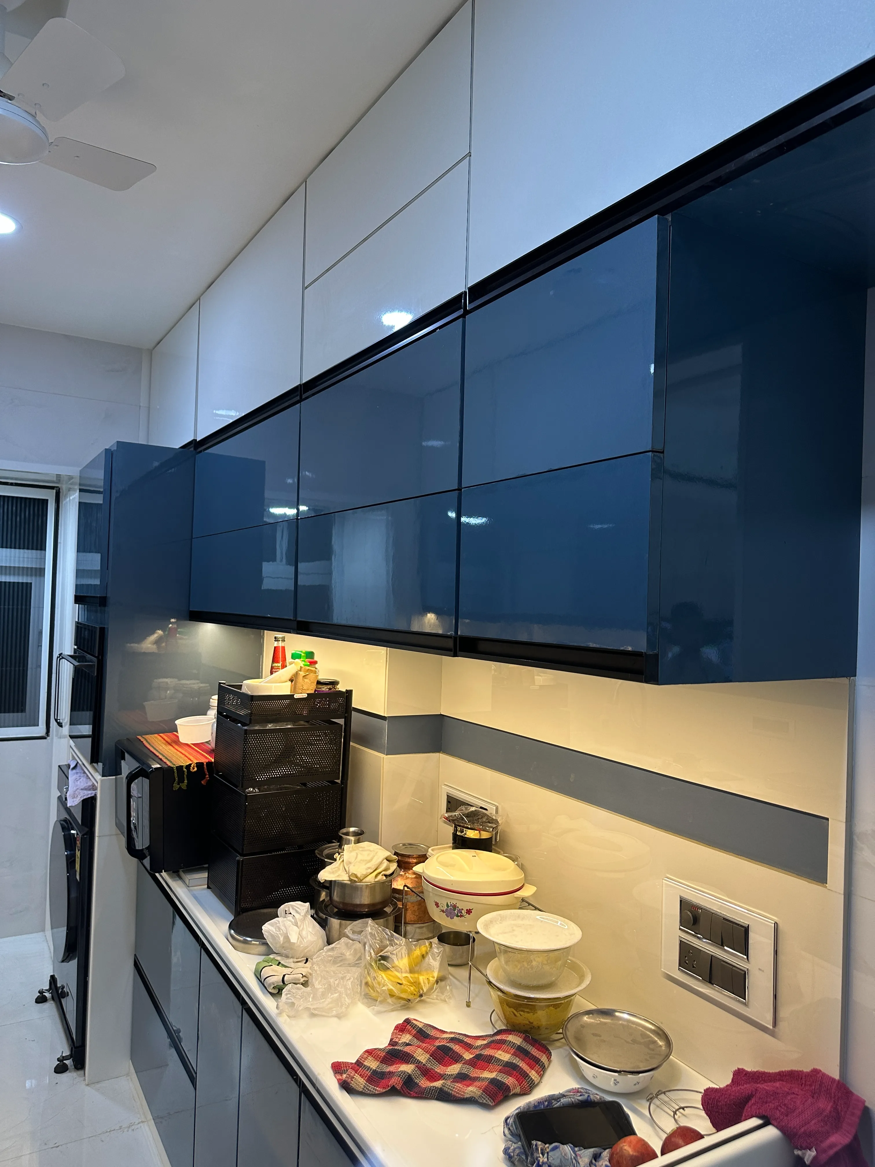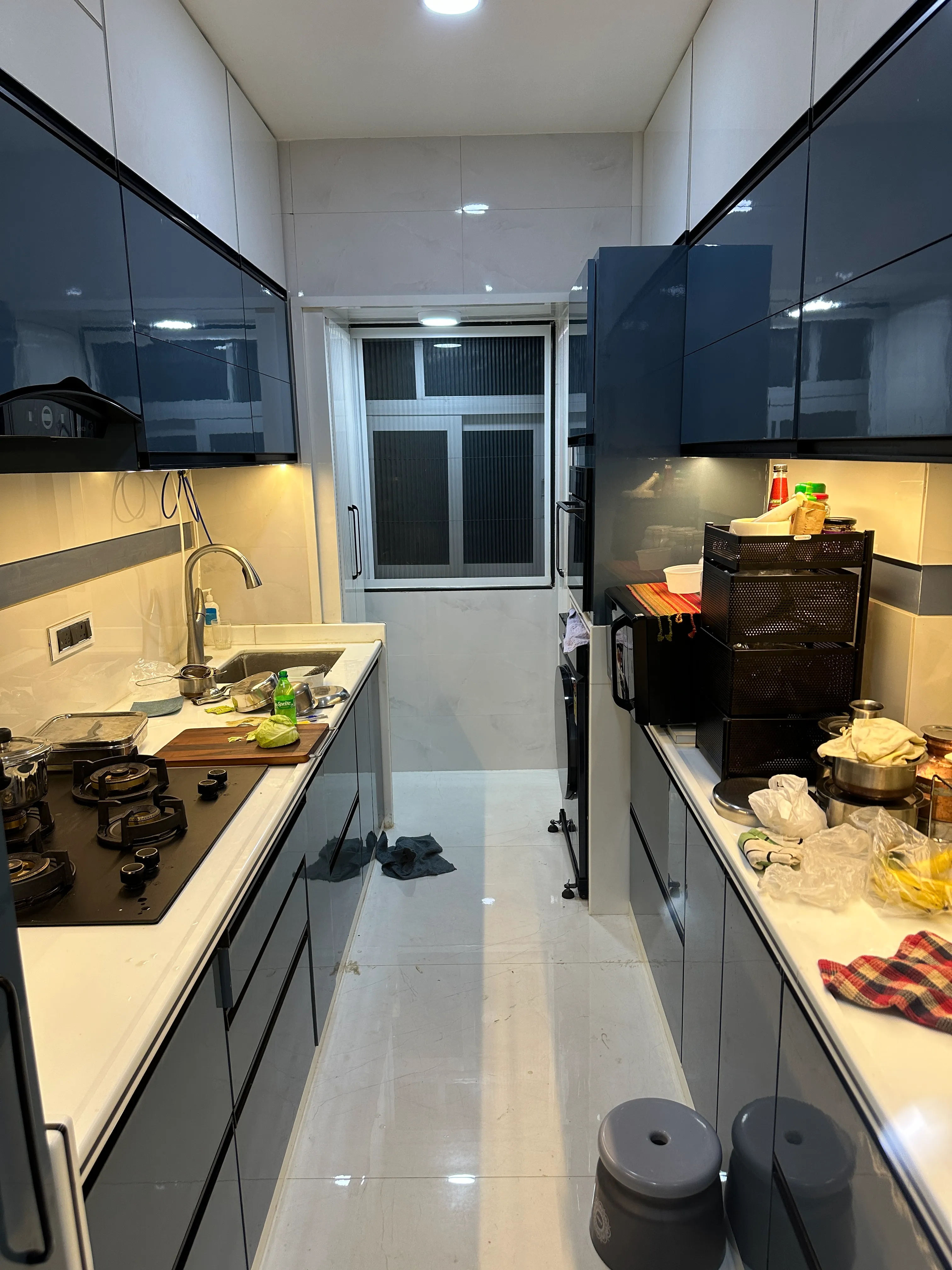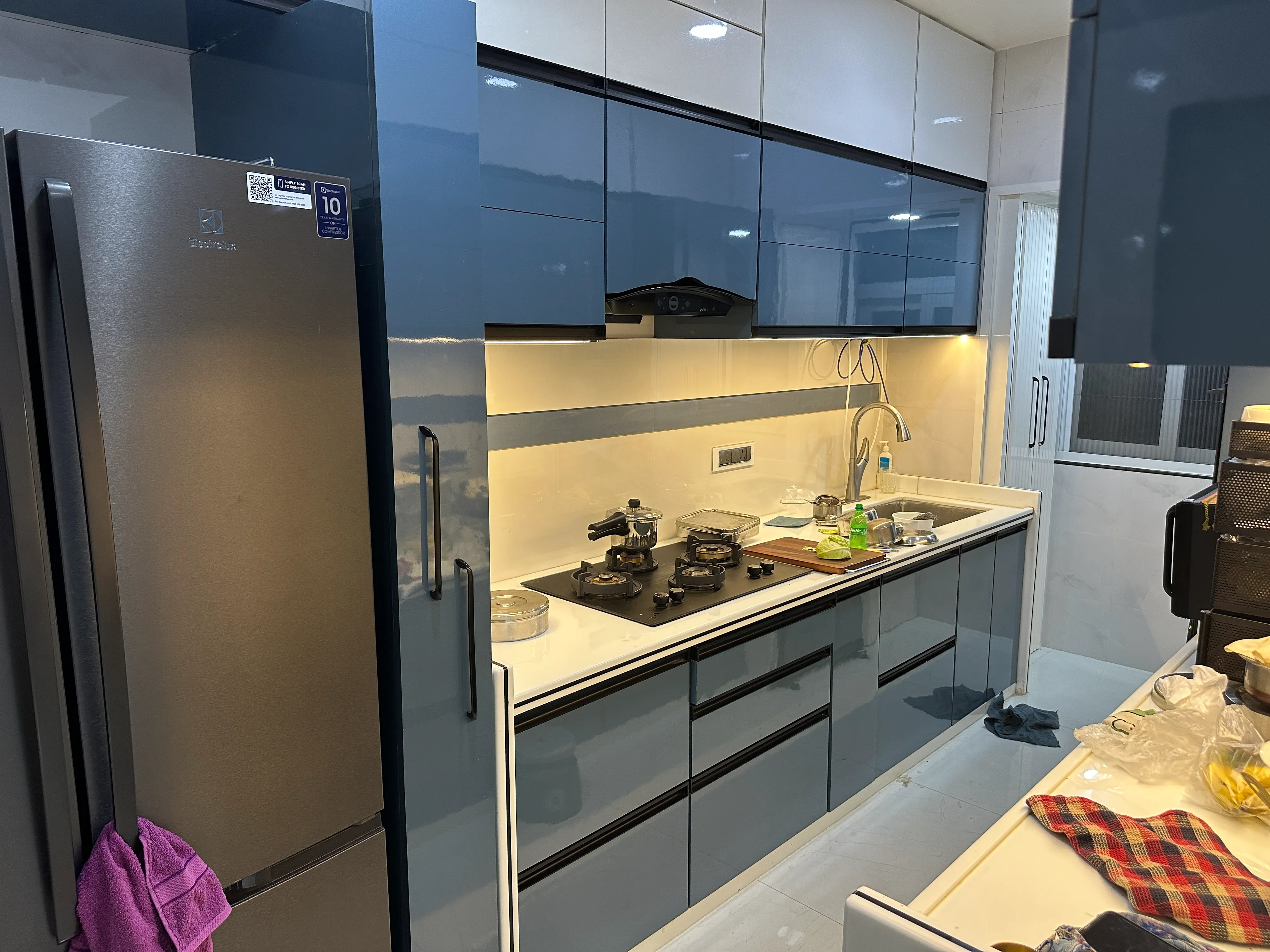 The aim for this kitchen was to create an efficient, open-plan workspace that handles the demands of daily cooking while remaining the polished focal point of the main living area. We selected handleless, easy-to-maintain cabinetry in a modern, light-grey or white laminate, establishing a sleek, monolithic aesthetic. A durable, light-toned quartz countertop provides ample prep area and contributes to a clean, reflective look. Essential appliances are seamlessly integrated, and practical overhead lighting ensures the space remains bright, functional, and visually clean.